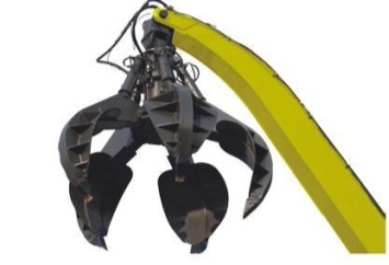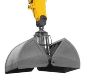 3)抓斗工作裝置:深井作業、裝卸物料。根據作業對象的不同,其結構形式主要有梅花抓斗和雙顎式抓斗兩種形式,雙顎式抓斗多作用于土方作業。