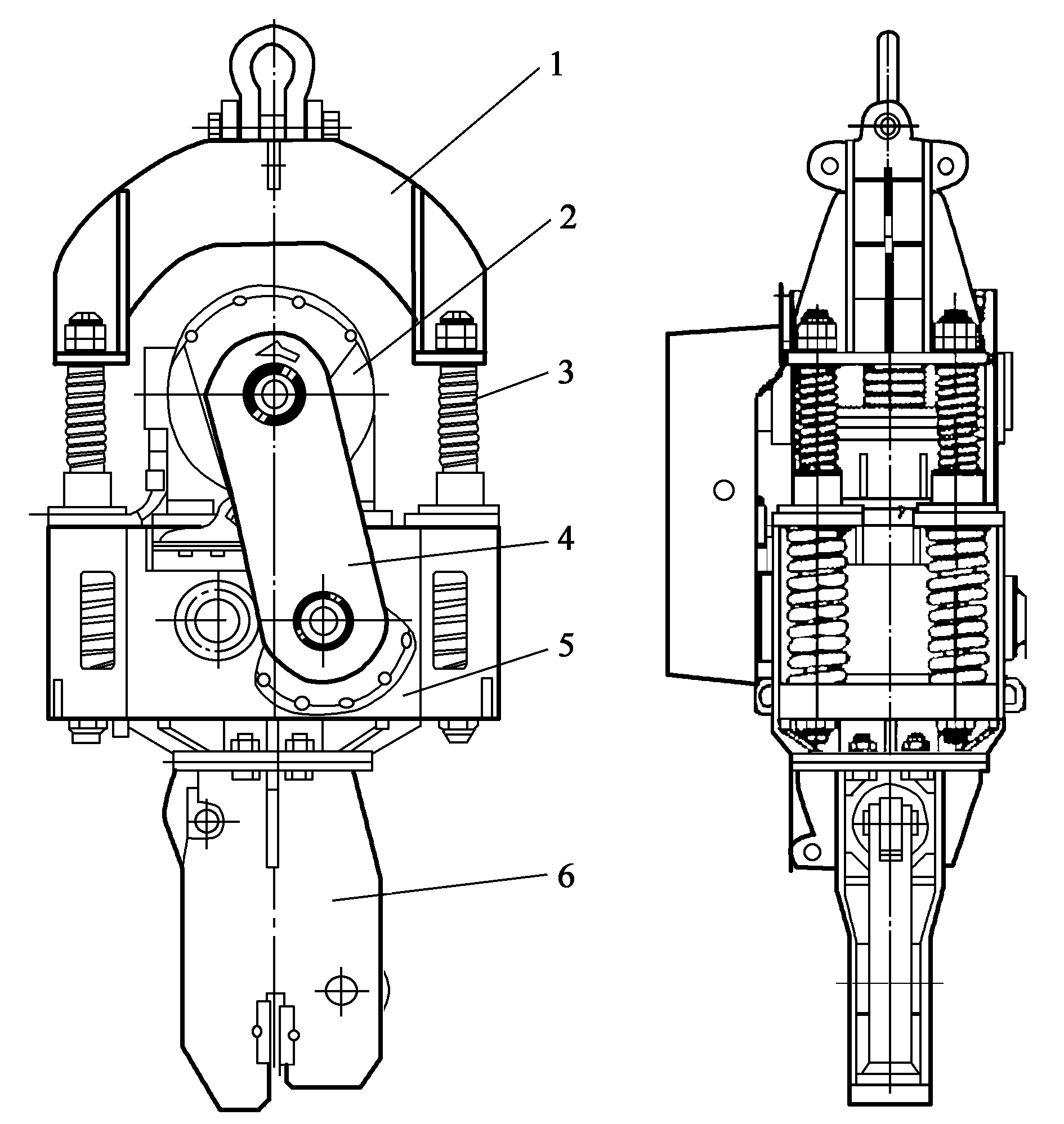1液壓缸;2液壓缸銷軸;3杠桿;4杠桿銷軸;5滑塊銷軸;6滑動塊